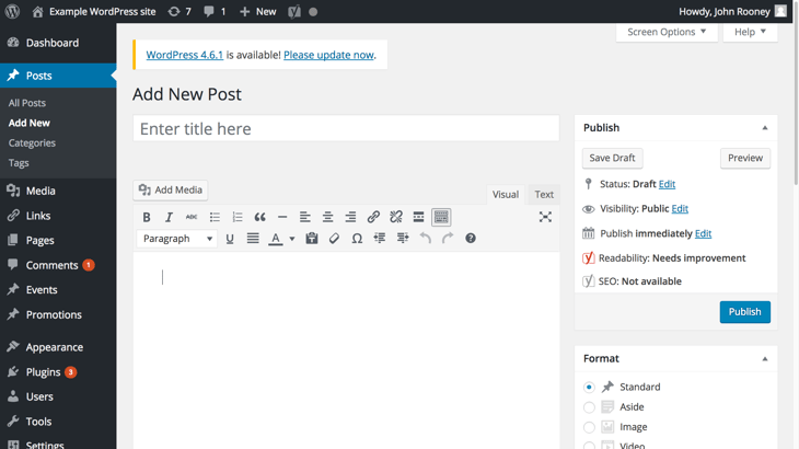 You can choose between writing your blog posts in ‘Visual’ (selected by default), ‘Text’ or ‘Distraction-free’ writing modes, the latter of which removes the left hand navigation bar and dialogue boxes down the right-hand side.